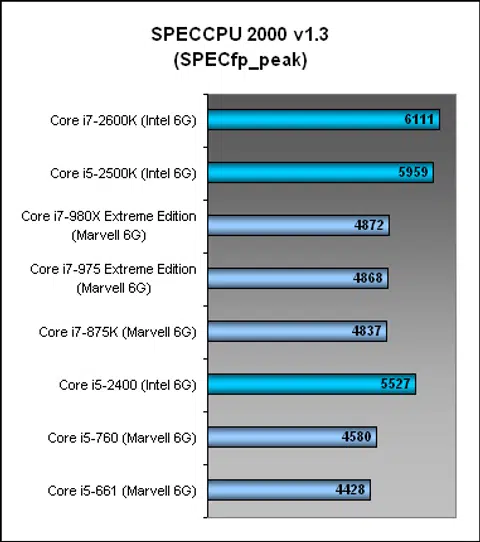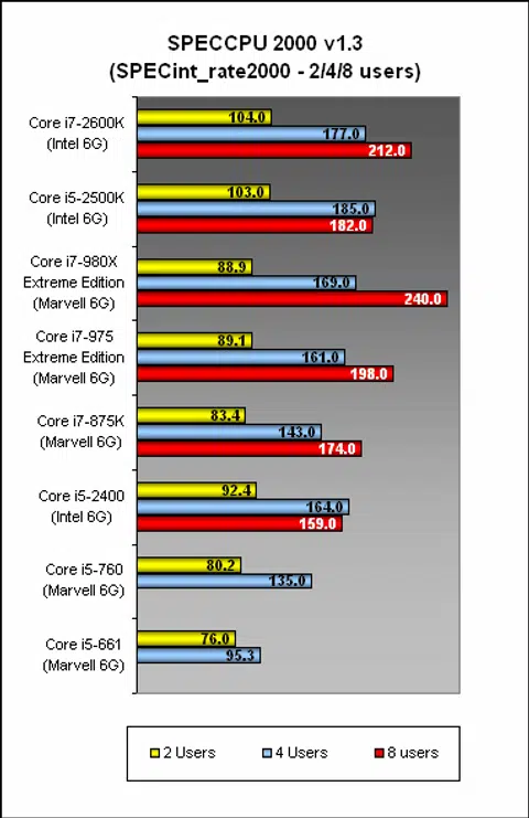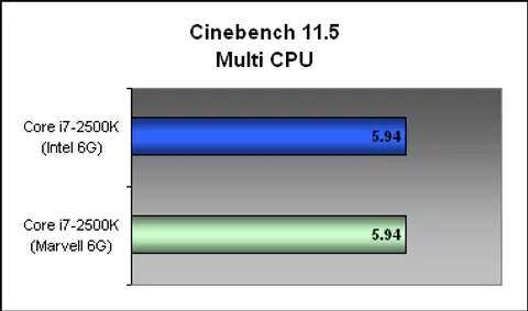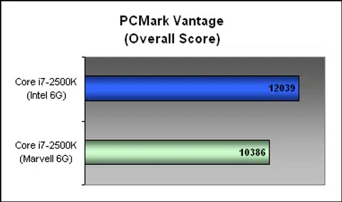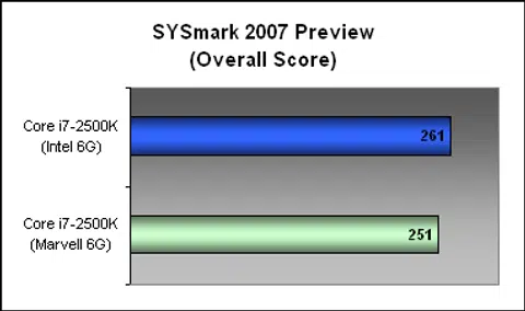 As for the performance discrepancies that we noted, below is an example of the Core i7-2500K on the Intel 6G and the Marvell 6Gbps controllers in some of our benchmarks: