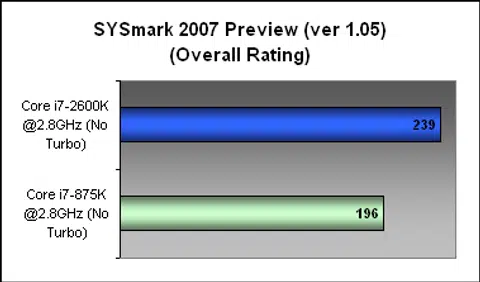 The surprise here is that when we deliberately stripped Sandy Bridge of its Turbo Boost advantage, it was at best 20% faster than the previous generation in your system benchmarks. Yet combined with Intel's Turbo Boost version 2.0, we get a performance level that surpasses the top processors of the Westmere generation.