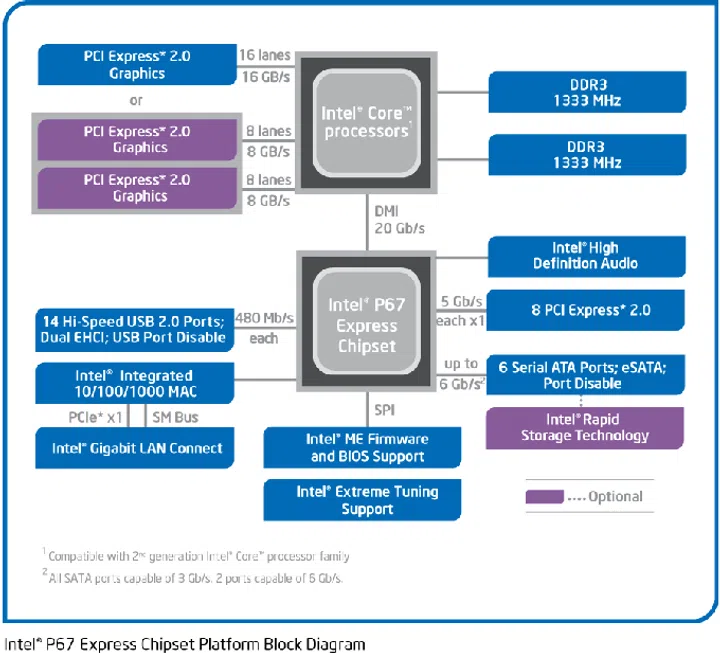 Designed for those who are pairing their Sandy Bridge processor with a discrete graphics solution, Intel's P67 Express chipset is targeted at the performance mainstream crowd. It's also the only option for consumers that require multi-GPU support, with CrossFire/SLI supported thanks to its two PCIe 2.0 x8 lanes. On paper, it's an incremental upgrade from the previous P55 Express chipset, with the main difference being the presence of SATA 6Gbps support on the P67. Best of all, the eight PCIe 2.0 lanes from the chipset is rated at a full 5Gb/s bandwidth, a big leap from the 500Mb/s on the 5-series. This should provide sufficient bandwidth for other onboard controllers and devices, from more SATA 6Gbps controllers to USB 3.0.
