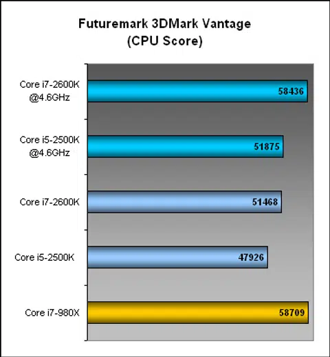 When it comes to the overall 3DMark Vantage score, it's more or less determined by your graphics card. The CPU score however told us how the processors fared, with the 980X surging ahead of the Sandy Bridge processors. The Core i5-2400 meanwhile narrowly beat the Core i7-875K, but was itself slower than the Core i7-975 Extreme Edition.