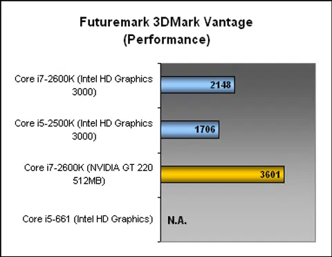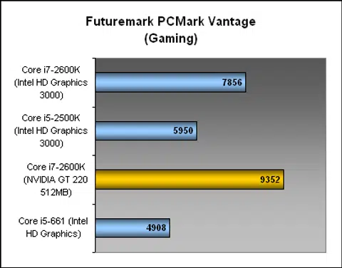 In any case, what we found was that while the new gen Intel HD Graphics improves over the older Clarkdale (like the Core i5-661 here), it is however, far from replacing even a low-end discrete graphics solution. Let's take 3DMark Vantage for example: the Core i5-661 could not complete this benchmark due to its performance inadequacies, but both the Core i7-2500K and 2600K did. Given the 25% difference in scores between the two K processors, the dynamic maximum frequency on these integrated graphics appears to have quite the impact. Unfortunately, even Intel's best was not equal to an NVIDIA GT 220 512MB discrete graphics card.