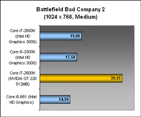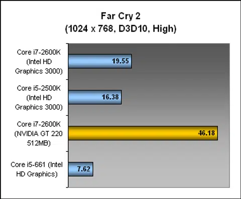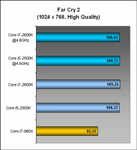 As for the performance of Sandy Bridge in actual games, we found that the new processors led to quite a boost in Far Cry 2 scores, but there was no corresponding increase in scores in Battlefield Bad Company 2.