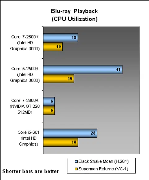You'll see more of the same in the following benchmarks, with the GT 220 clearly the superior solution. This was also evident when we played two Blu-ray movies - the NVIDIA PureVideo HD solution resulted in a much lower CPU utilization than the others. It could be a case of unoptimized software, since support for Intel's new Sandy Bridge hardware is still limited and we had to use a beta version of CyberLink PowerDVD 10 for this test.