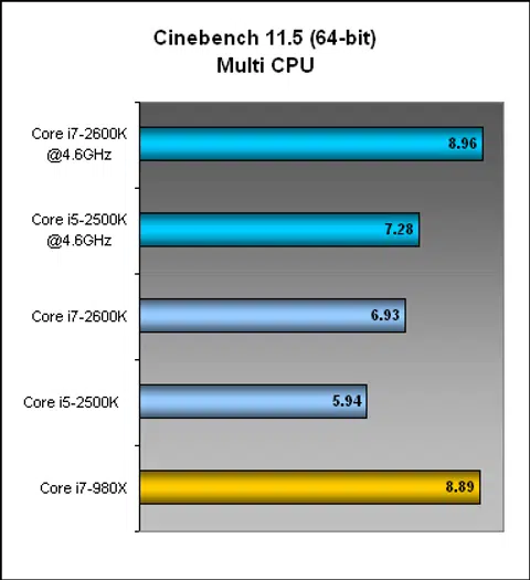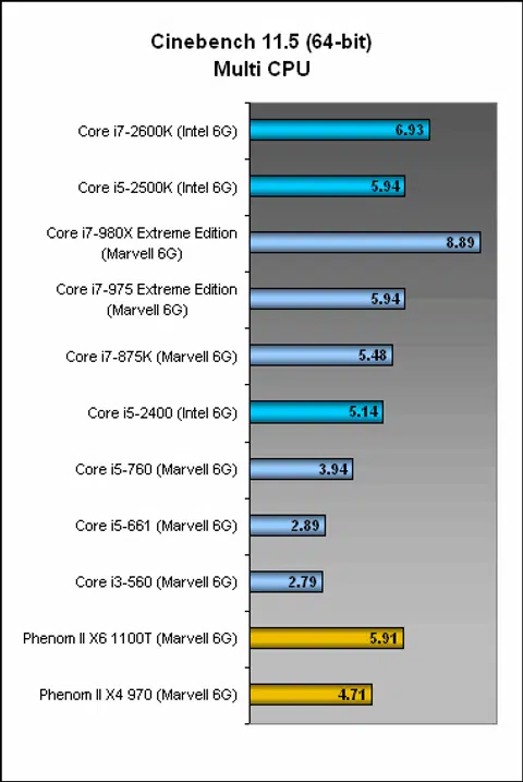 Cinebench 11.5 was a rare win for the Core i7-980X. Presumably, this benchmark was better able to tap into the potential 12 threads on the 980X and this resulted in a commanding lead over the Sandy Bridge contingent. From the gap between the 2600K and the 2500K, it's evident that HyperThreading is much favored here and the main reason for the 980X's performance. Witness too, the improved performance of AMD's 6-core processor here.