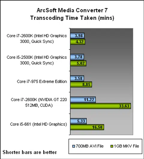 Anyway, it's in the transcoding that Sandy Bridge looked convincing against the usual discrete graphics suspects. The Core i7-2600K was racing through the 1GB MKV file (transcoded for AppleTV, H.264, 720p) and finished faster than the Core i7-975 Extreme Edition (CPU) and way ahead of the NVIDIA GT 220 using CUDA. It all sounds very positive, but then we discovered that when we had the NVIDIA GT 220 installed on our Core i7-2600K, there was no option in the software to toggle Quick Sync, even though it was a H67 board that supported the integrated graphics.