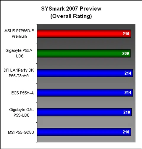 The two new boards performed as expected in our system benchmark suite. The numbers were marginally off the top scorers but it was a very slight difference. The further results breakdown showed that these numbers were typical of these P55 boards, with the ASUS doing better than the rest in Productivity but less so in 3D.