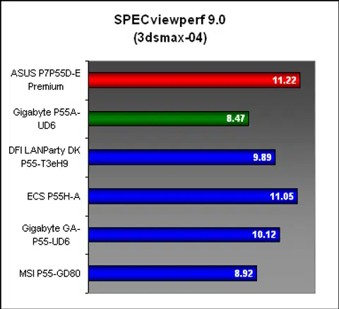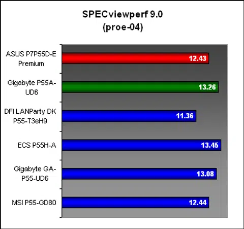 We have been seeing quite some fluctuation in SPECviewperf 9.0 on our Windows 7 system with these P55 motherboards and again, the ASUS and Gigabyte produced some varying results. While the ASUS did fairly well in both viewsets, the Gigabyte had a more mixed outcome, doing pretty well in the memory intensive PRO/ENGINEER workload but failing to impress in 3dsmax.