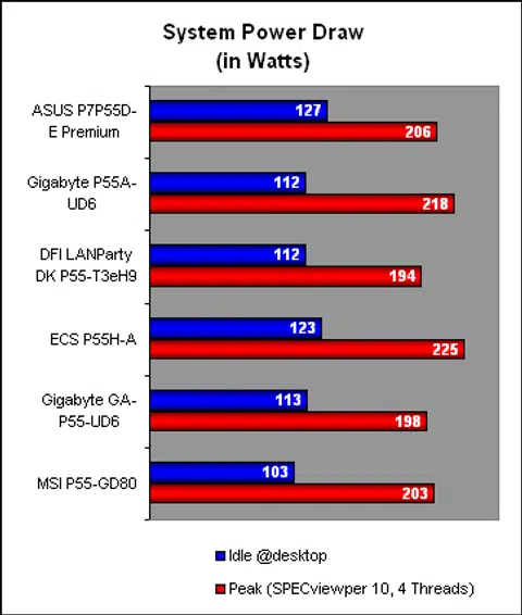 Power consumption was another area where these two boards performed like the top tier boards that they belong to. The ASUS had slightly higher idle power draw than its competitors but it was not significant and its peak power draw was similar to the best performers. The Gigabyte P55A-UD6 meanwhile had one of the lower idle power draws, though it did pull in slightly above average power at peak. Overall, both boards are doing fine, considering that they have extra components that may draw more power.