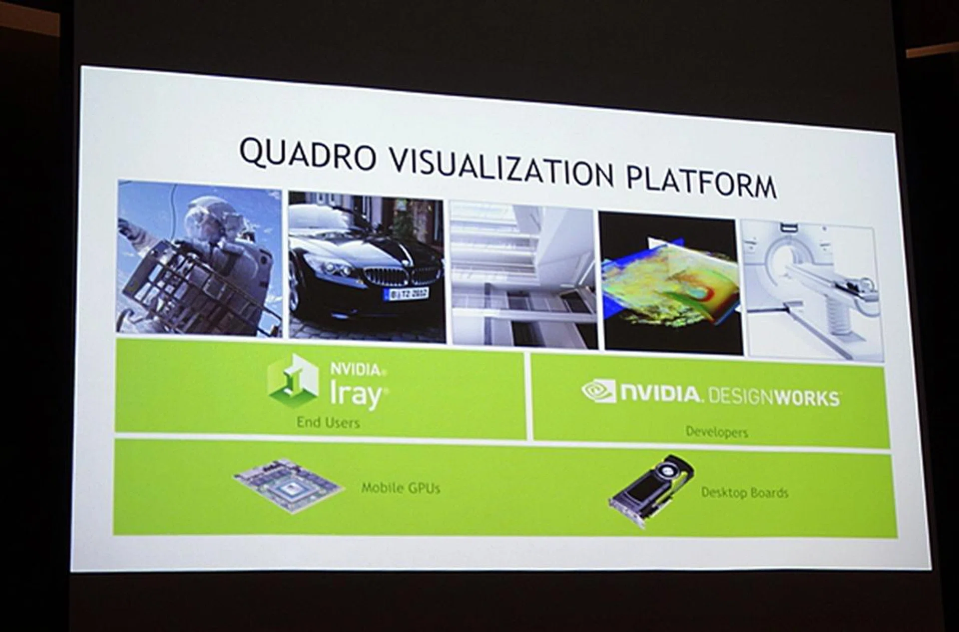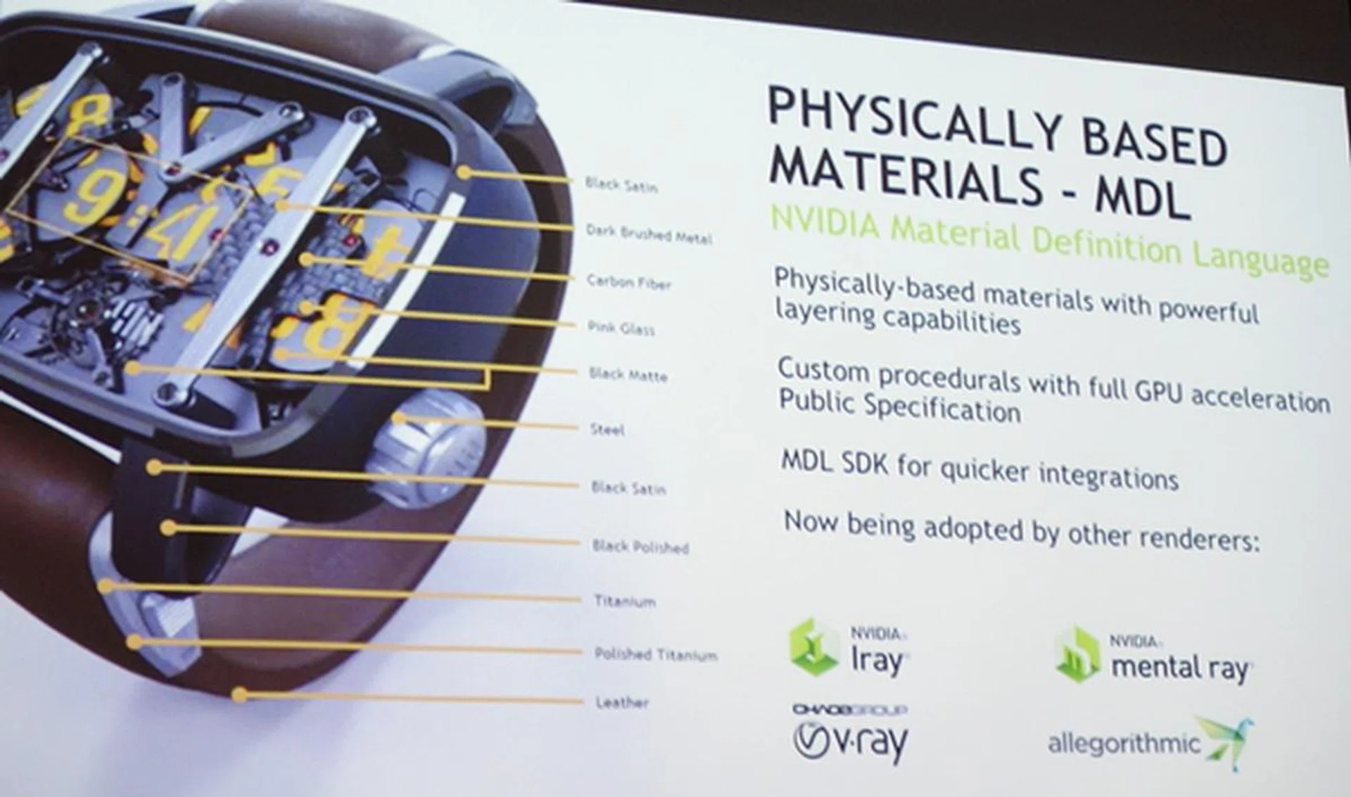 Iray, MDL and its accompanying vMaterials are all parked under the DesignWorks platform as it encompasses the "software tools, libraries, and technologies” that support real-time ray tracing and physics-based rendering. It also includes NVIDIA OptiX, which is the framework that allows for development of physics-based rendering (PBR) applications. Additionally, it supports Quadro VCA to allow for scalability of GPU compute requirements. With VCA, PBR applications can be scaled across physical nodes to suit the needs of enterprise graphics compute requirements.