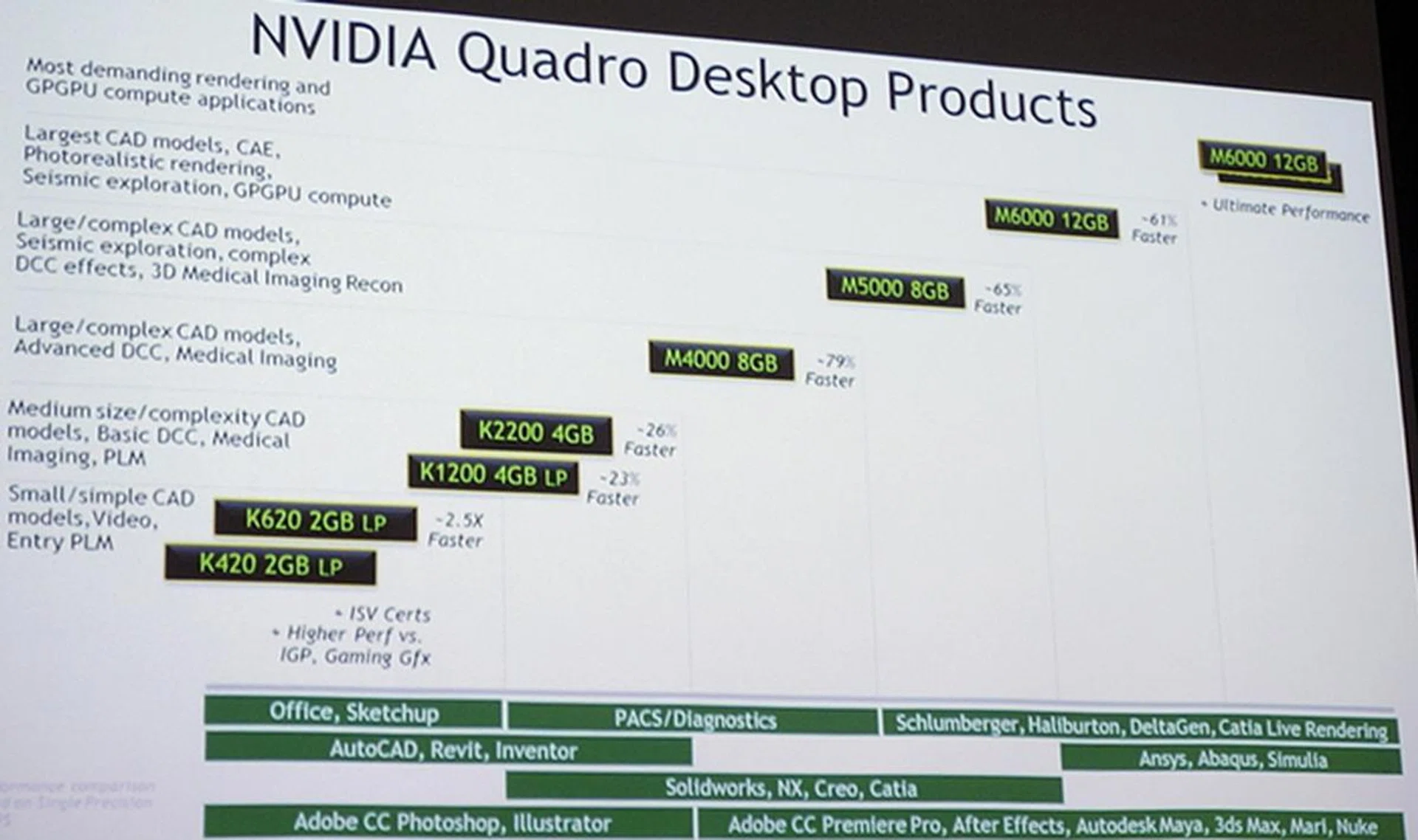 NVIDIA also shared with us a quick glance of their current Quadro desktop GPUs that support all of the new DesignWorks updates shared earlier. At the top of its current offerings is the Quadro M6000 that features Maxwell GM200 GPU with 12GB of GDDR5 video memory.