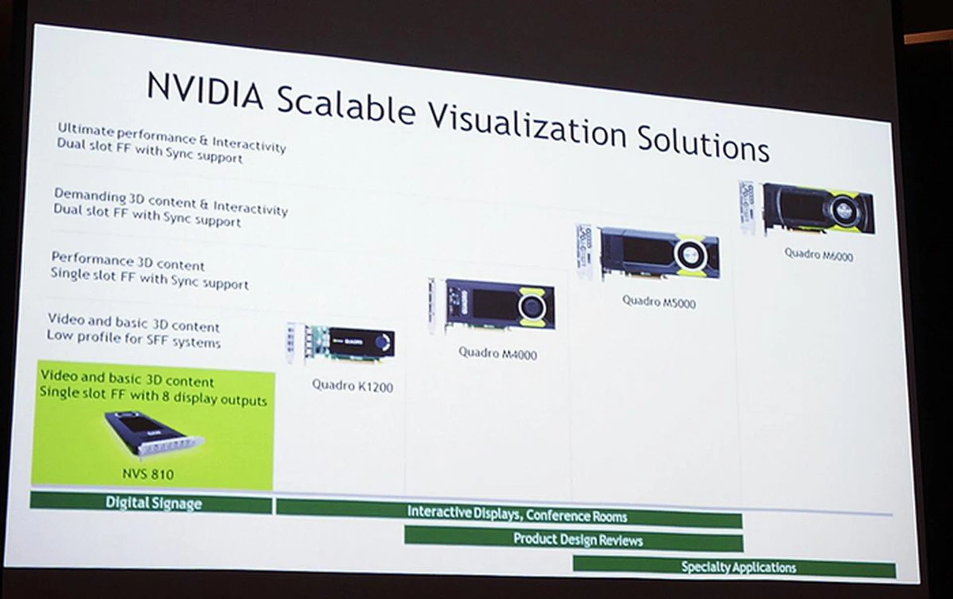 NVIDIA has display solutions for large visualization requirements like billboards and signage based on Quadro GPUs. In fact, NVIDIA currently powers the word's largest 4K video display at a horse racing track that costs US$12 million! For signage that is smaller, there's the single-slot NVS 810 graphics card that features 8 mini-DisplayPort outputs.