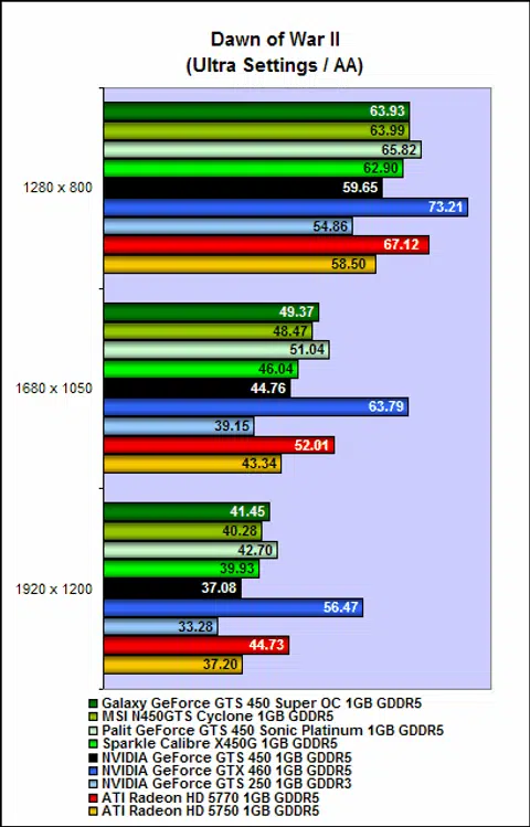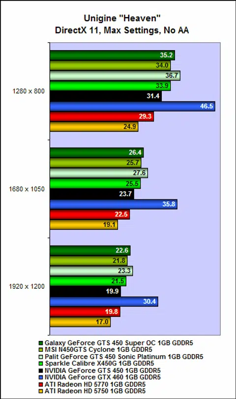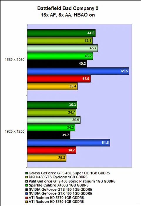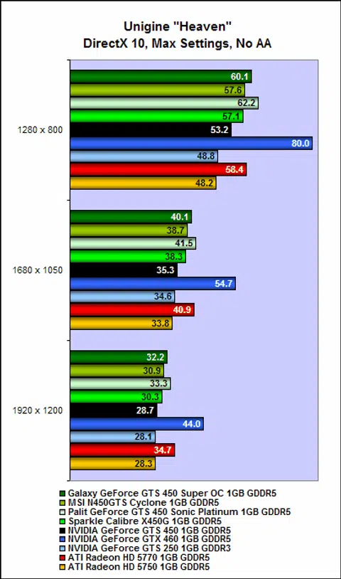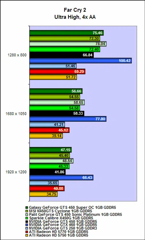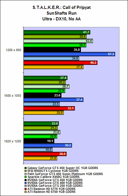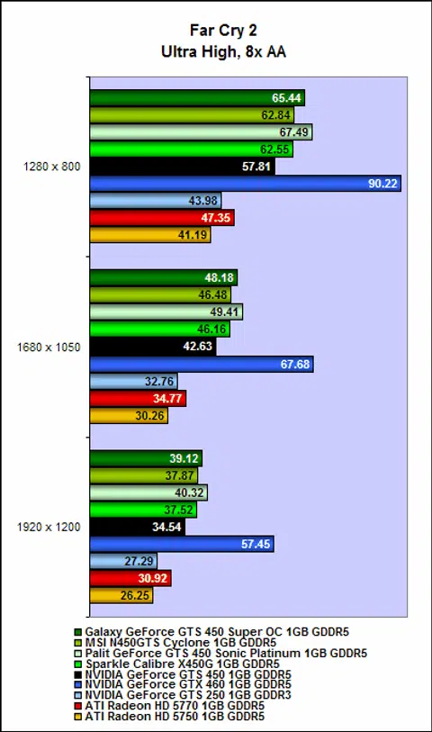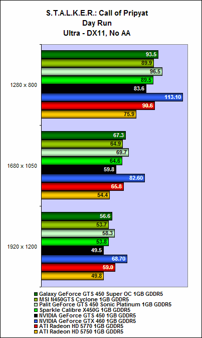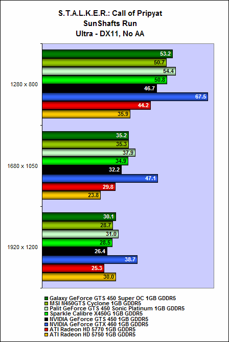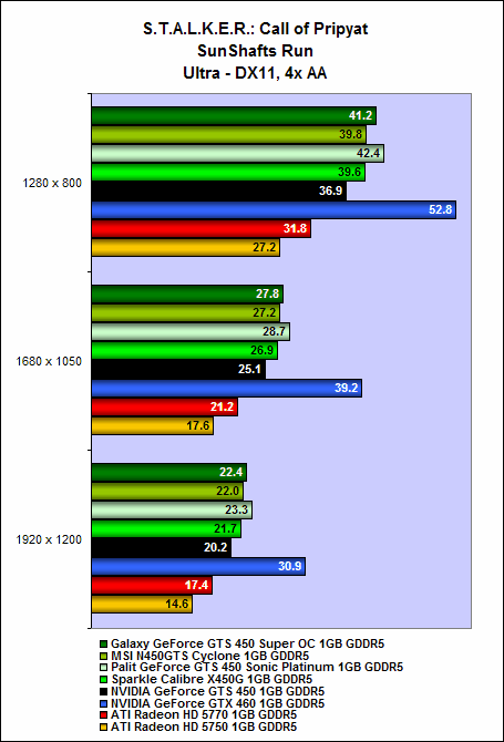 The Palit GeForce GTS 450 Sonic Platinum once again stormed to a lead with the Galaxy GeForce GTS 450 Super OC right on its tail And again, it was difficult to separate the MSI and Sparkle cards, which recorded almost identical frame rates.
