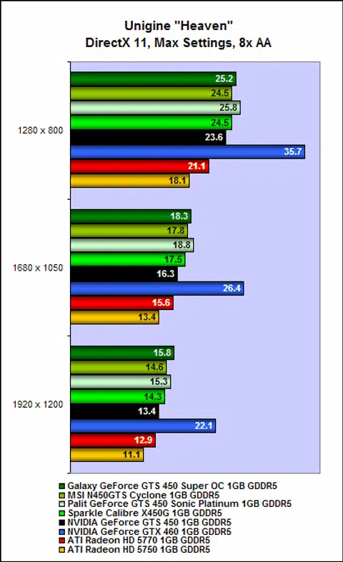 On Unigine 2.1, an application which stresses tessellation operations, the GeForce GTS 450 did well. With tessellation enabled, the GeForce GTS 450 was able to outclass the Radeon HD 5750 by more than 10%, and it was also a match for the Radeon HD 5770, outperforming it slightly.