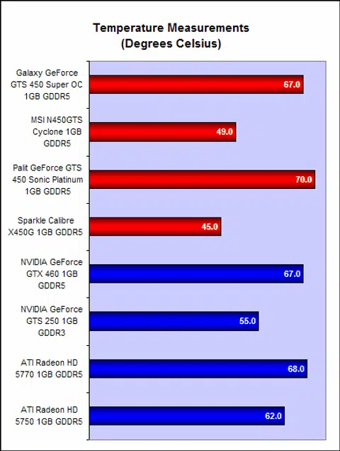 We didn’t include results of the reference GeForce GTS 450, because we didn’t have a card with a reference cooler to properly ascertain the temperature.