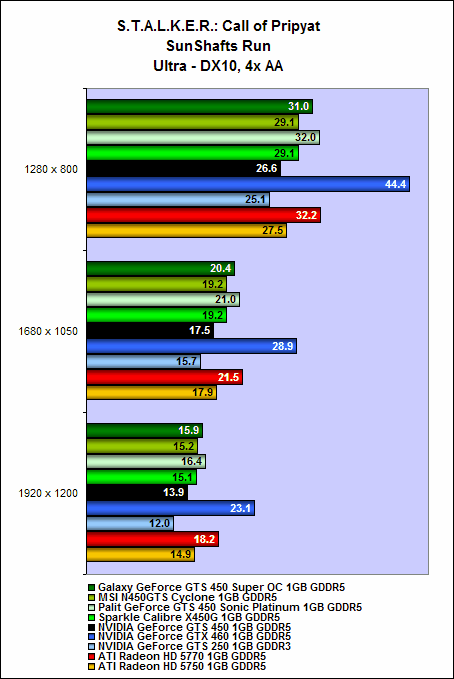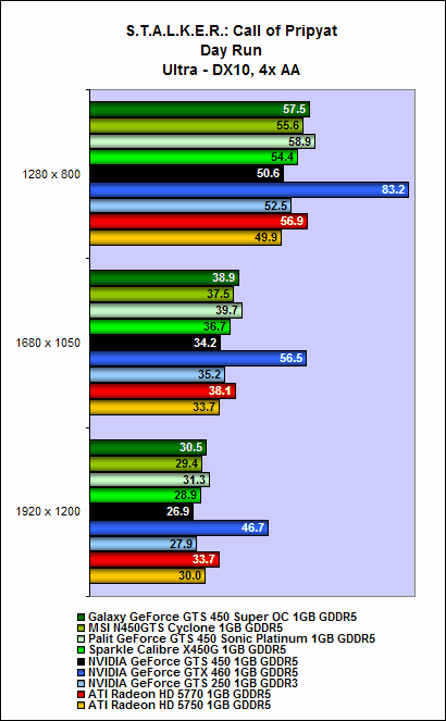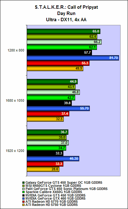 On S.T.A.L.K.E.R.: Call of Pripyat, we again witnessed the superiority of the Fermi architecture in handling tessellation applications. On the runs with DirectX 11 enabled, the GeForce GTS 450 was, in most instance, faster than the Radeons from ATI. But when we reverted to the older DirectX 10 API, the Radeons fought back, with the both the Radeon HD 5770 and HD 5750 outperforming the GeForce GTS 450.