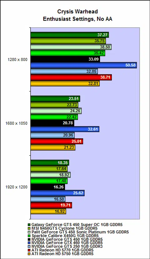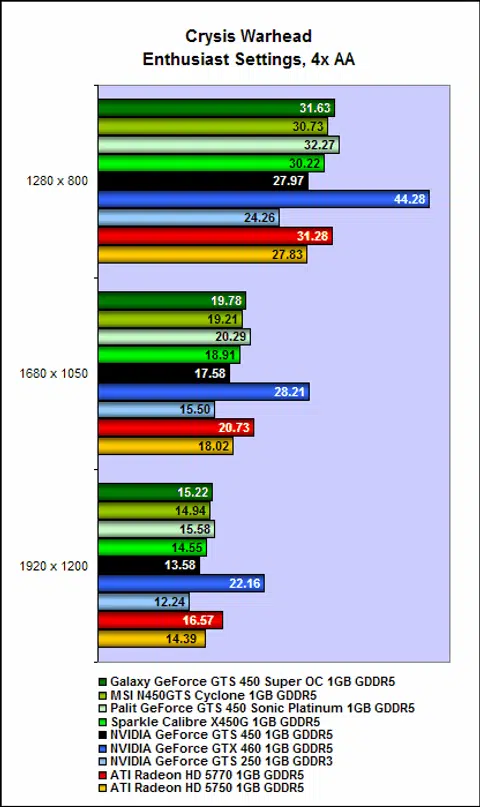 The Palit GeForce GTS 450 Platinum was ahead of the pack on Crysis Warhead thanks to its insanely high clock speeds, but the Galaxy GeForce GTS 450 Super OC wasn’t that far behind - the difference between the two is barely a frame. Because of their comparable clock speeds, the MSNI N450GTS Cyclone and Sparkle Calibre X450G were very close.