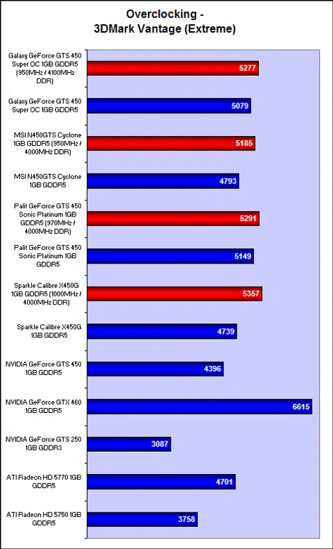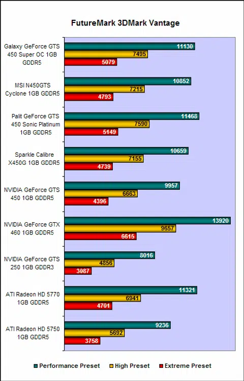 Unsurprisingly, the Palit GeForce GTS 450 Sonic Platinum was the highest scoring GeForce GTS 450 card, followed by the Galaxy GeForce GTS 450 Super OC, which wasn’t that far behind to be honest, and then the MSI N450GTS Cyclone and Sparkle Calibre X450G, both of which got very comparable scores.