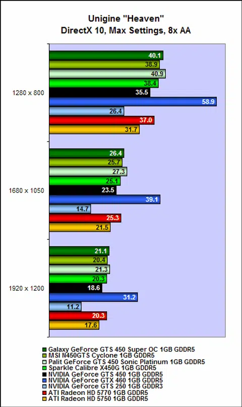 But when we disabled tessellation and ran Unigine on DirectX10, the Radeon cards fought back, with the Radeon HD 5770 snatching the lead back from the GeForce GTS 450. The less powerful HD 5750 also proved to be a handful for the reference-clocked GeForce GTS 450.