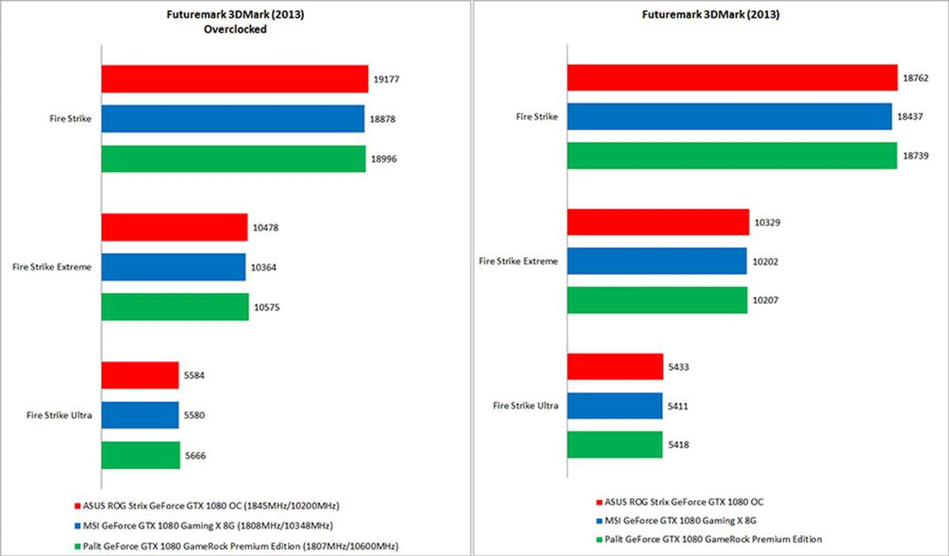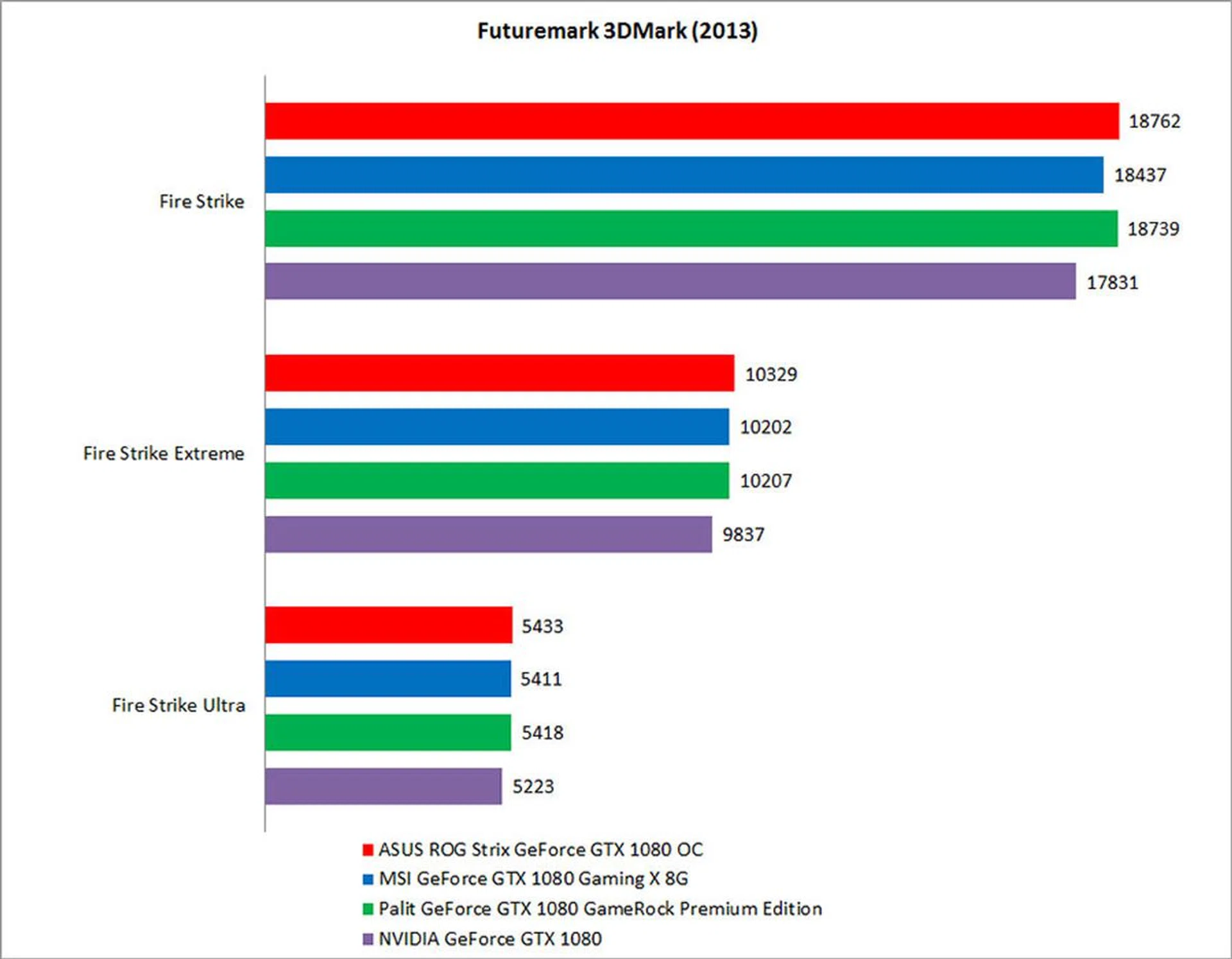 As the card with the most aggressive clock speeds, it was no surprise that the ASUS ROG Strix GeForce GTX 1080 managed to edge ahead of the competition. The Palit GeForce GTX 1080 GameRock Premium Edition wasn’t far behind though, and it was within a single percentage point of the ASUS card in 3DMark Fire Strike. The MSI card also ended up trailing the other two in 3DMark, no doubt due to it having the lowest clock speeds (even in OC mode) of the three tested cards.