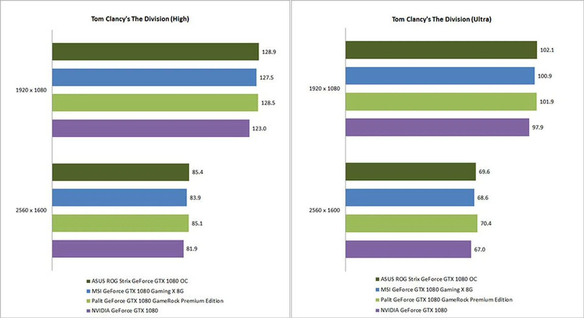 Having said that, we’d caution against parsing the numbers too closely. It’s not really the best approach to quibble over small differences in clock speeds and performance. For one, you only have to look at the results obtained in Tom Clancy’s The Division to see how close the cards actually perform to each other. More often than not, a single frame barely separates two cards, and you can be sure that you won’t notice any difference when actually playing.