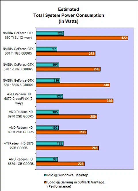So as we've found, a 2-way SLI configuration consisting of two GeForce GTX 560 Ti is certainly a formidable one. However, it does have a few drawbacks. Fortunately, noise wasn’t one of them as even the reference cooler is fairly quiet, but power consumption certainly is. As seen in our graphs, the power draw of the GeForce GTX 560 Ti is uncharacteristically high, and with two in an SLI configuration, matters get worse. In our tests, our highest sustained reading was a considerable 422W, which means a solid PSU rated for at least 650W or 700W (to be safer) would be needed. And that's assuming the system isn't loaded with many other add-ons.