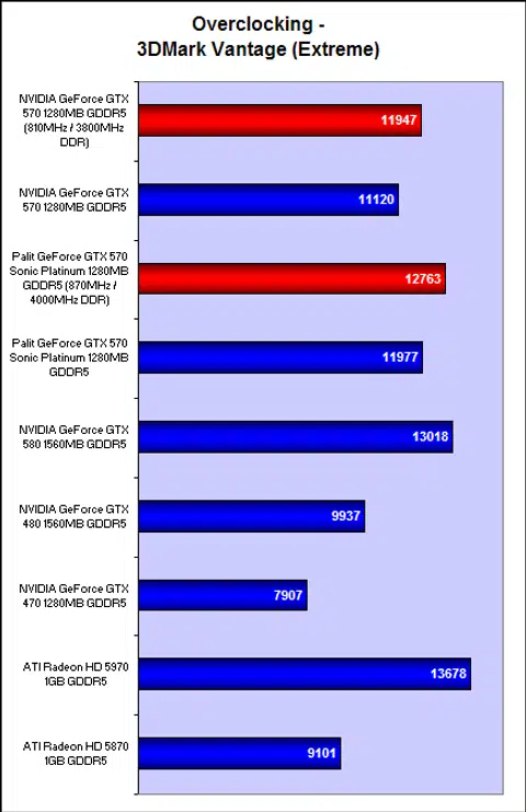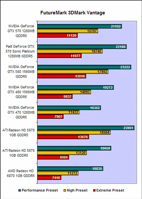 The Palit GeForce GTX 570 Sonic Platinum did well too, managing scores that were on average about 6% greater than that of the reference card from NVIDIA.
