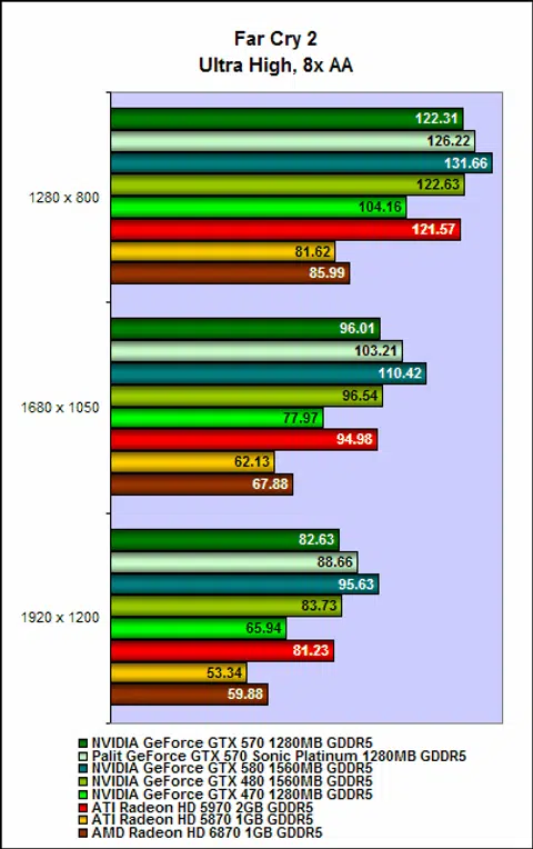 On Far Cry 2, the GeForce GTX 570 was about as quick as the GeForce GTX 480, but some way off the more powerful GeForce GTX 580. It was also comfortably faster than both the Radeon HD 5870 and HD 6870, the current flagship single GPU cards from ATI/AMD, and was only a fraction slower than the dual-GPU Radeon HD 5970.