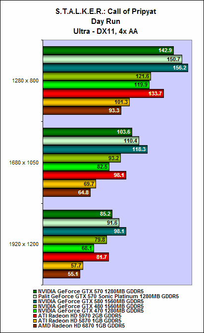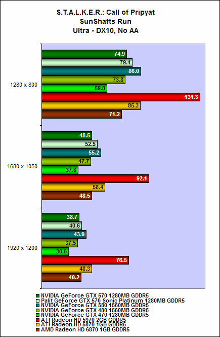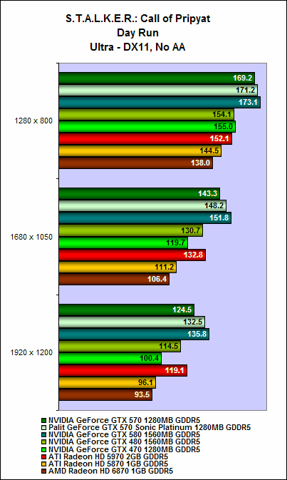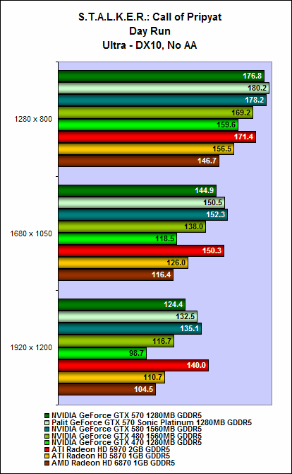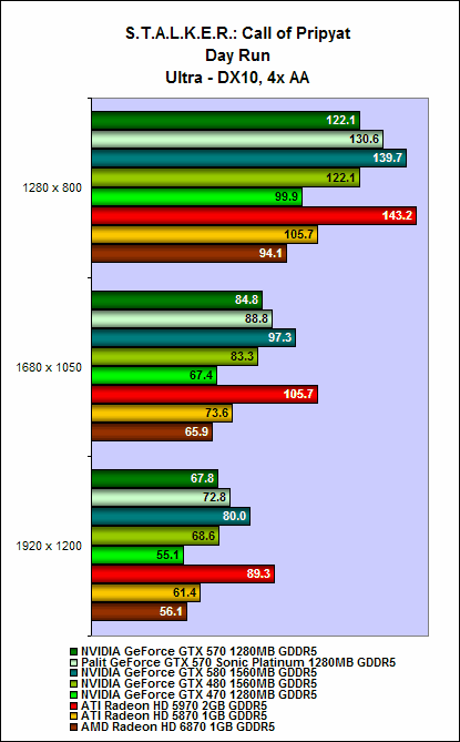 On S.T.A.L.K.E.R.: Call of Pripyat, the GeForce GTX 570 was significantly faster than the GeForce GTX 480 when tessellation was enabled. But when we reverted to DirectX10 and disabled tessellation, the GeForce GTX 570 lost its advantage and was on a par with the GeForce GTX 480.