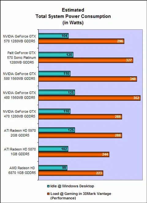 Moving on, we were happy to find that the GeForce GTX 570 not only runs cooler, but also more efficiently. Obviously, much of this has to do with the better optimized core and NVIDIA’s specially designed vapor chamber cooler.