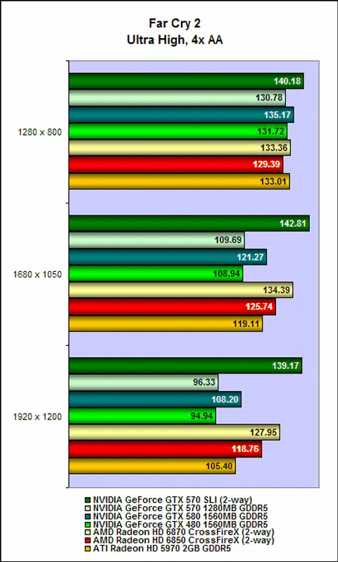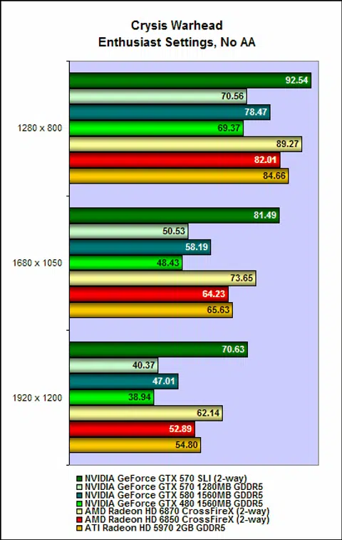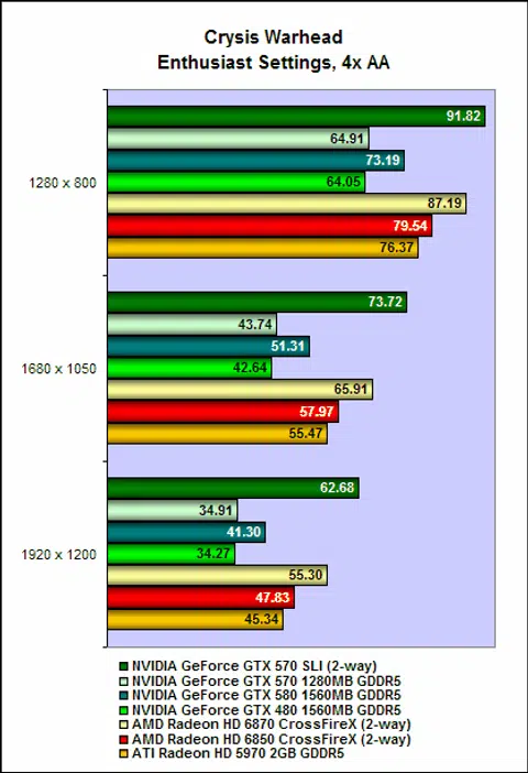 Unsurprisingly, two GeForce GTX 570 cards in an SLI configuration is a fearsome combination and it blows away any dual-GPU solution ATI/AMD has. Furthermore, scaling performance is very respectable, especially on higher resolutions and more intensive settings. For example, running Crysis Warhead at 1920 x 1200 with 4x anti-aliasing enabled saw a decent 82% boost in performance over a single GeForce GTX 570.
