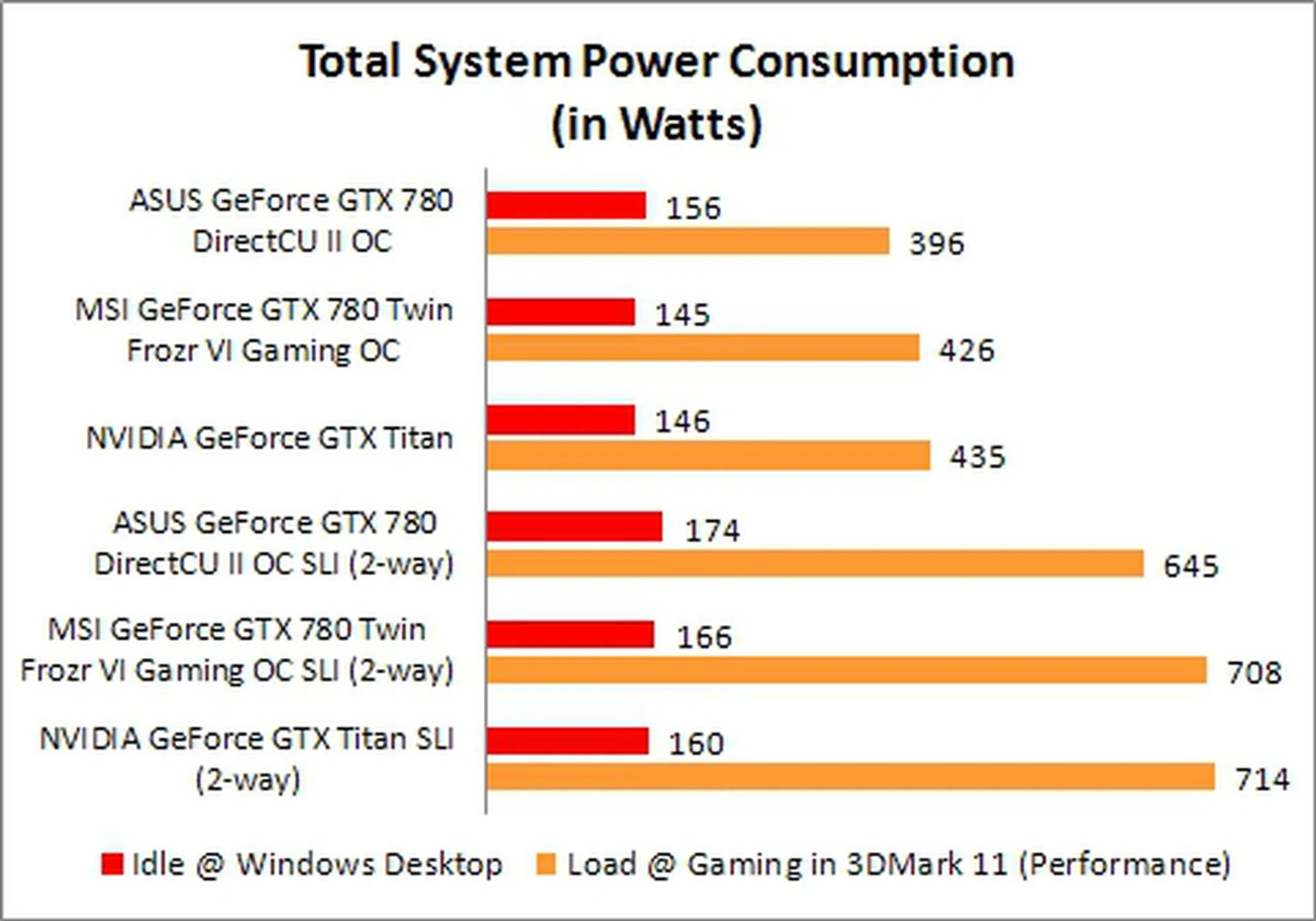 At its idle state, the MSI's GeForce GTX 780 card surprisingly drew the least power at 145W, but under load, its power consumption level shot up to 426W. The ASUS GeForce GTX 780 had the lowest power consumption levels under load, as a single card as well as in 2-way SLI configuration. The outcome is very likely due to the lower clock speeds of the ASUS card, but it's still nevertheless overclocked and from what we've tested before, the reference card actually reported higher temperatures that matched the MSI graphics card. Oddly, the ASUS card registered the highest power draw at idle. Meanwhile, power consumption profiles of the MSI GeForce GTX 780 and the reference GeForce GTX Titan were rather similar during our testing.