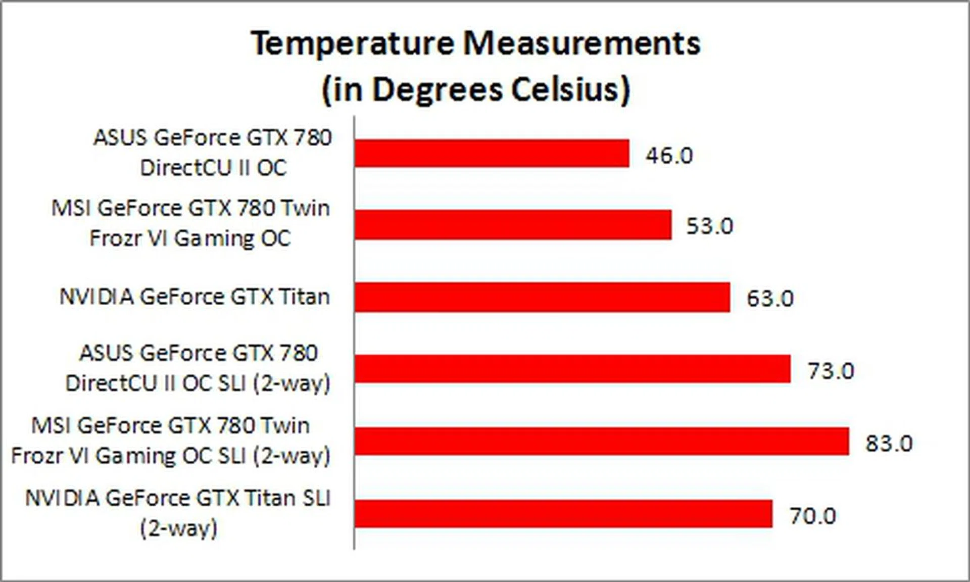 The custom cooler of the ASUS GTX 780 card proved to be extremely effective in cooling the card. It had the lowest operating temperature at just 46 degrees Celsius! While under load in 2-way SLI configuration, it also had the second lowest temperature of 73 degrees Celsius. This was because the pair of Titans recorded an even lower operating temperature at 70 degrees Celsius. Their lower operating temperatures were also due to their lower clock speeds of their GPUs. The MSI GTX 780 card has the highest clock speed of 902MHz; while ASUS is rated at 889HMz, and the reference GTX Titan is rated at 836MHz. Surprisingly, the temperature results across the board seem much lower than anticipated with the latest driver set, but we're still in the midst of verifying if they are the main reason. In any case, the relative standings are looking positive for ASUS.