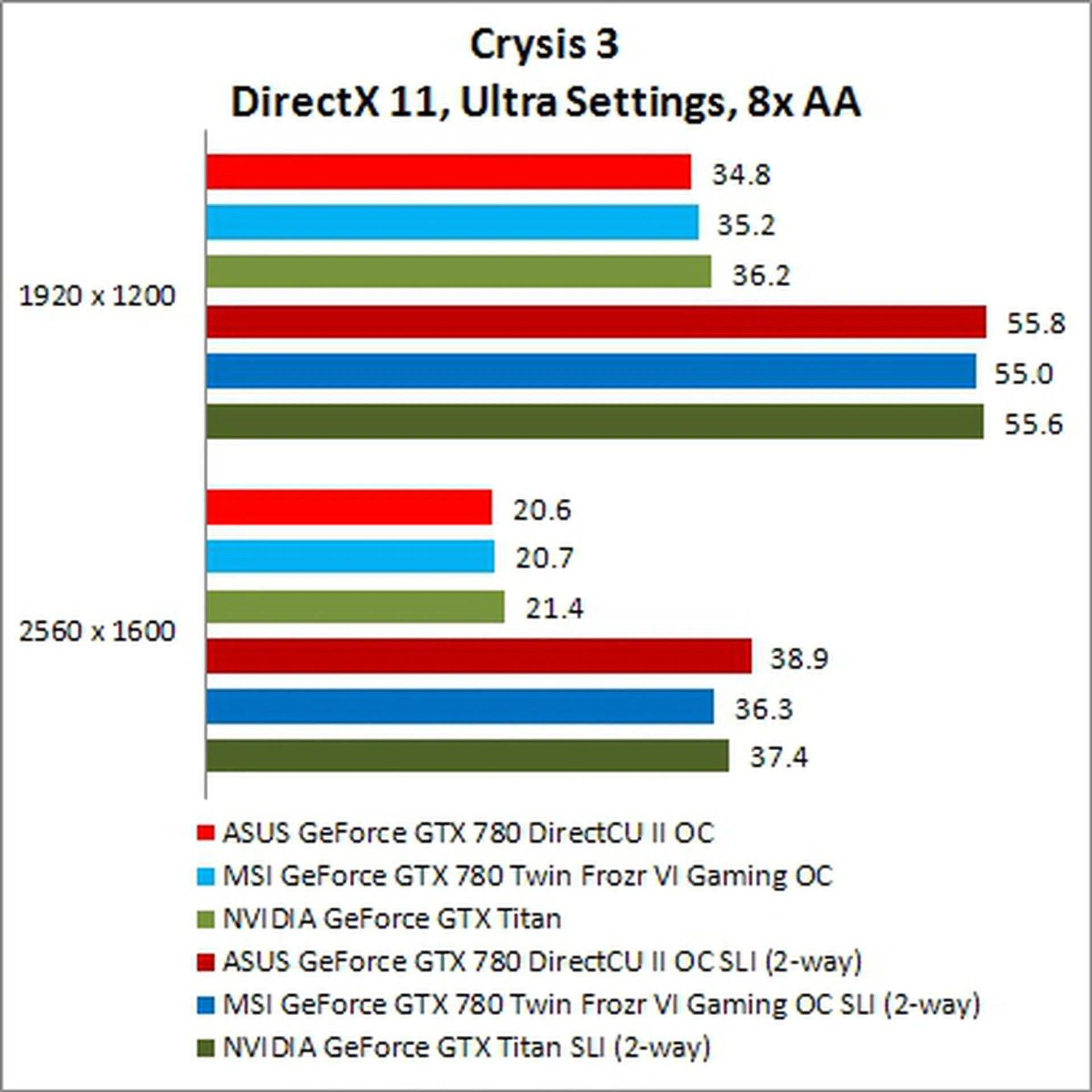 In its 2-way SLI configuration, the ASUS GeForce GTX 780 cards pulled surprisingly pulled up ahead of the MSI GTX 780 and reference GTX Titan cards. At the resolution of 2560 x 1600 pixels, the ASUS cards managed to pull ahead of the Titans by just a hair! As single cards, the custom GTX 780s and the GTX Titan were almost running neck-to-neck at both resolutions.