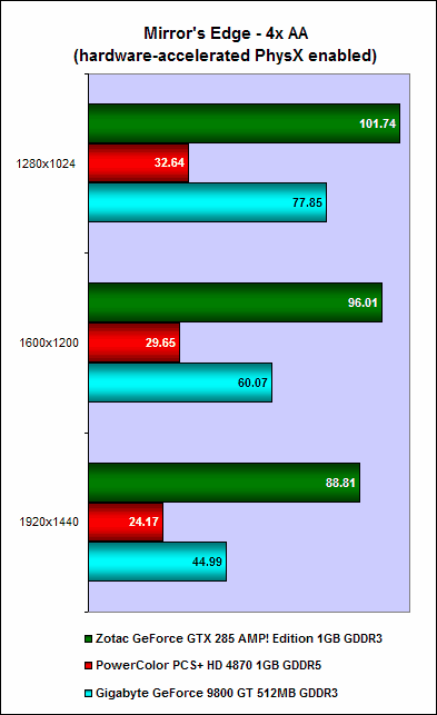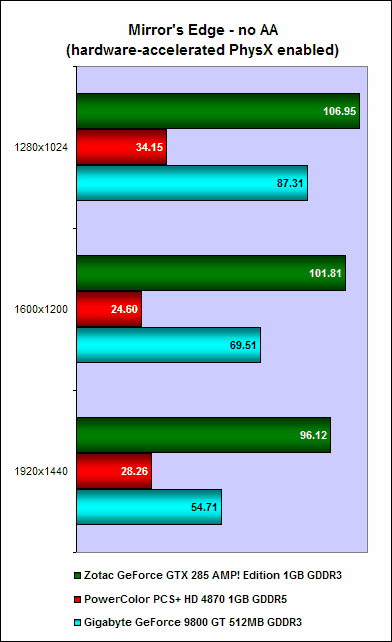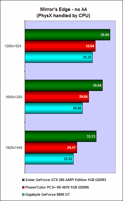 First we ran Mirror's Edge on High settings with hardware-accelerated PhysX turned off, meaning all PhysX processes were handled solely by the CPU.