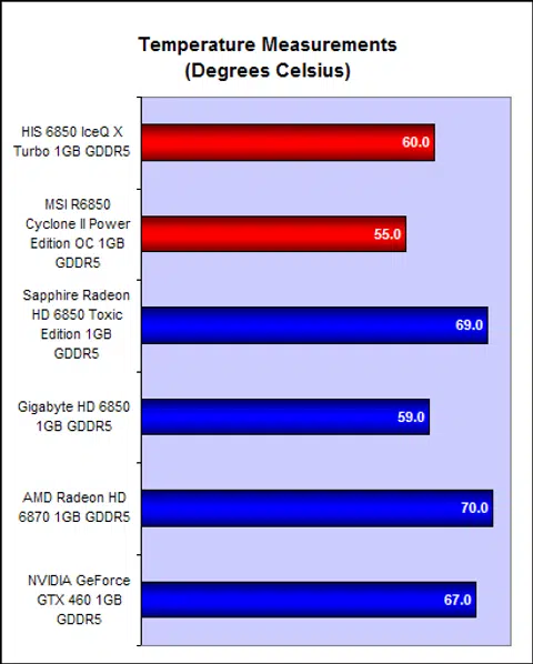 The most notable distinction between the two cards is probably the effectiveness of their custom coolers. Under load, the MSI card was 5 degrees Celsius cooler than the HIS card. Even so, the two cards recorded two of the coolest temperatures we’ve ever had for a Radeon HD 6850, so even the difference in operating temperature isn't that much cause of a concern. Consider this, even the warmer HIS card was still a considerable 9 degrees Celsius cooler than the Sapphire card which won in our based on the available Radeon HD 6850 cards at the point of assessment then.