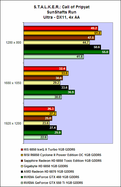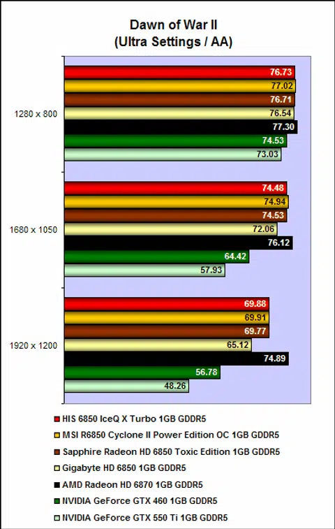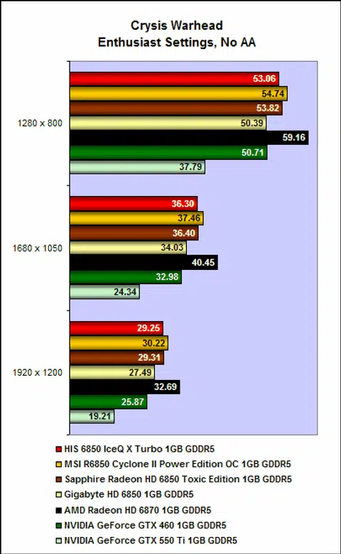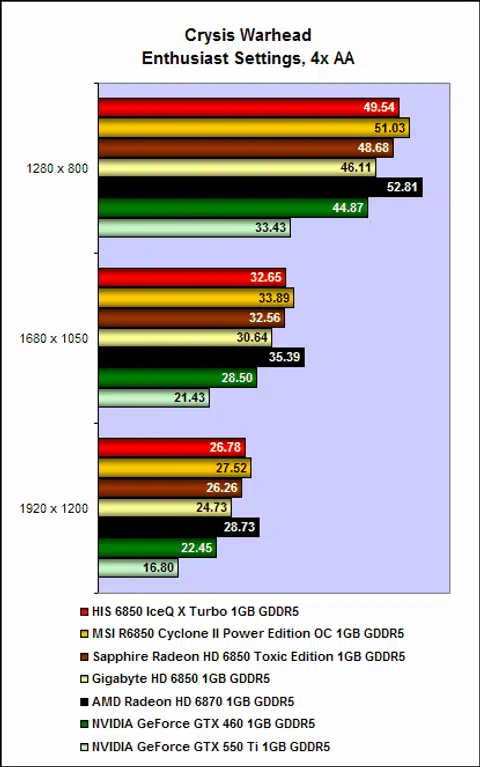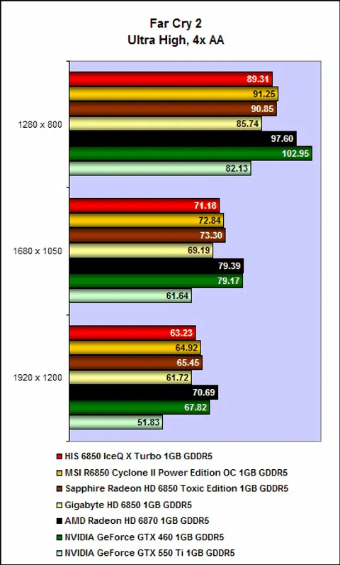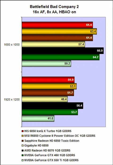 As we had expected, the MSI R6850 Cyclone II Power Edition OC with its higher clock speeds recorded higher frame rates than the HIS 6850 IceQ X Turbo. Even though the difference was slight, the fact is that the MSI card is able to distinguish itself from its competitors as one of the fastest Radeon HD 6850 cards in the market today.