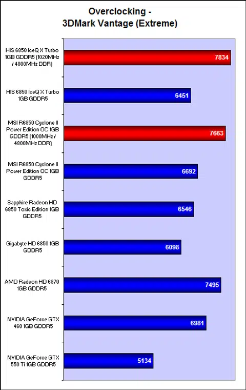 When it came to overclocking, the HIS 6850 IceQ X Turbo managed to edge out the MSI card by a smidge. It managed a maximum overclocking state of 1020MHz at the core and 4800MHz DDR at the memory, achieving 7834 3DMarks, 171 3DMarks or just 2% more than the MSI card, which achieved 7663 3DMarks with 1000MHz at the core and 4800MHz DDR at the memory. Again, the difference between the two cards are not much.