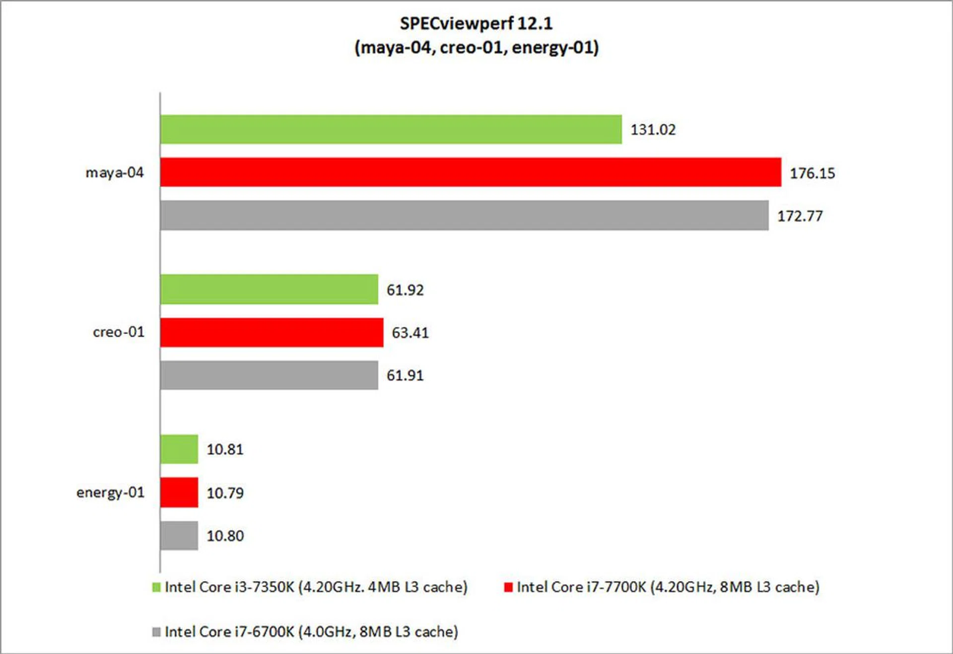 The Core i3-7350K actually put out nearly identical performance as the other two Core i7 chips in the creo-01 and energy-01 viewsets, signaling that those two rely almost exclusively on graphics performance as opposed to CPU power.