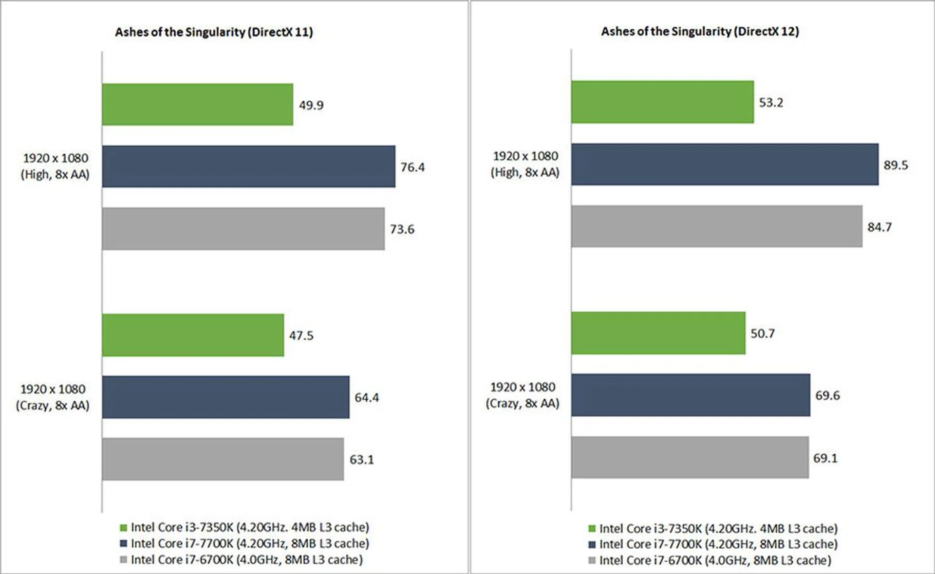 In Ashes of the Singularity, the Core i3-7350K was between 26 and 35 per cent behind the Core i7-7700K in the DirectX 11 benchmarks. The chip did not evince much of a performance drop when moving from the High to Crazy presets. This indicates that the GPU is already pushing the system as much as it could but, it's effectively being held back by the CPU - regardless of the graphics settings. Contrast this to the the Core i7 system's performance where you can tell that it could use more GPU power when you scale graphical settings and it isn't held back by the CPU.