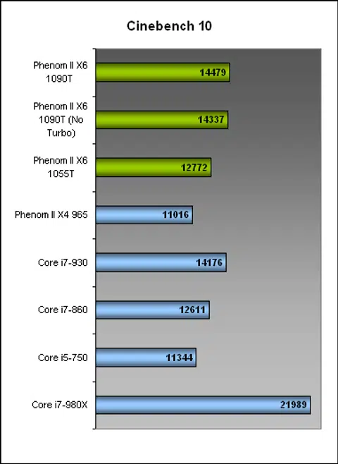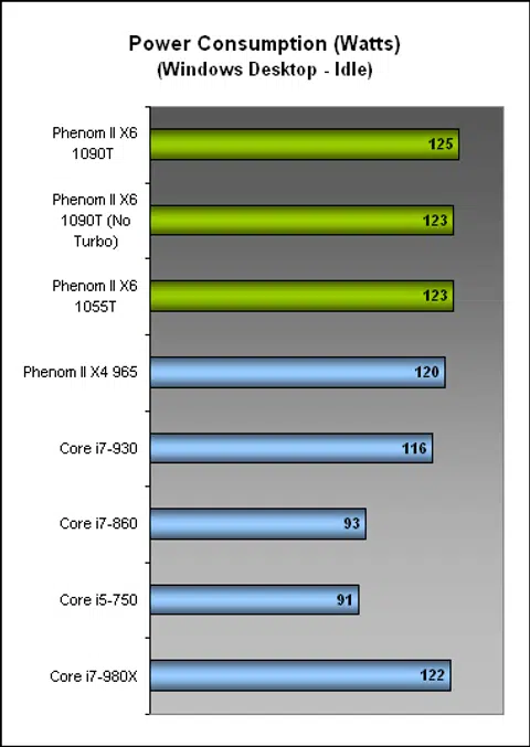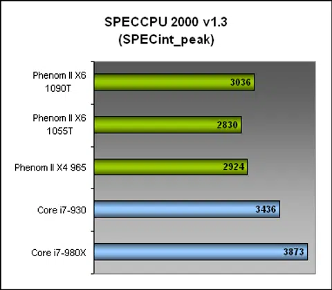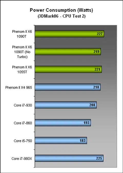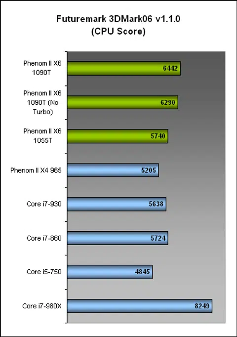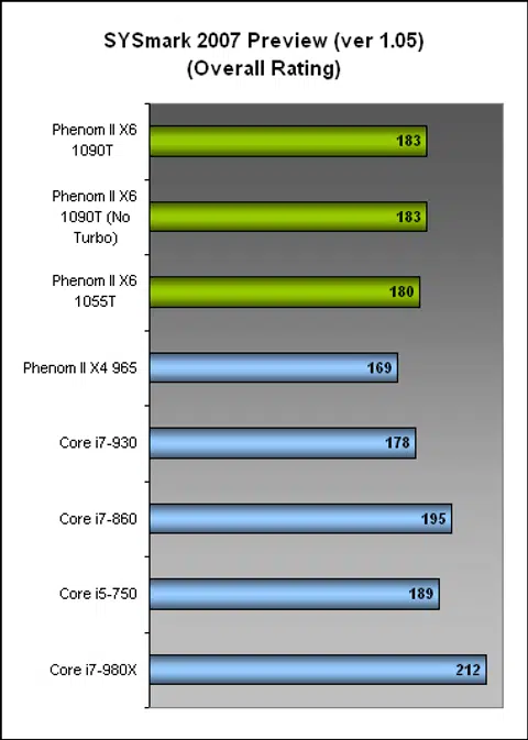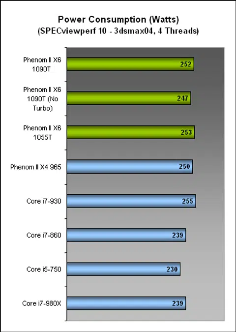 In any case, the two Phenom II X6 processors fared decently against their intended rivals. The 1090T was slightly faster than the Core i7-930, but lost out to the higher clocked Core i7-860. The 1055T lost out (though not by a lot) to its Intel competitor, the Core i5-750, which again, when running with Turbo Boost, has higher clocks than the Phenom II, not to mention that Intel has managed more instructions per second with its architecture.