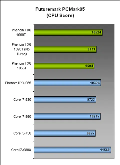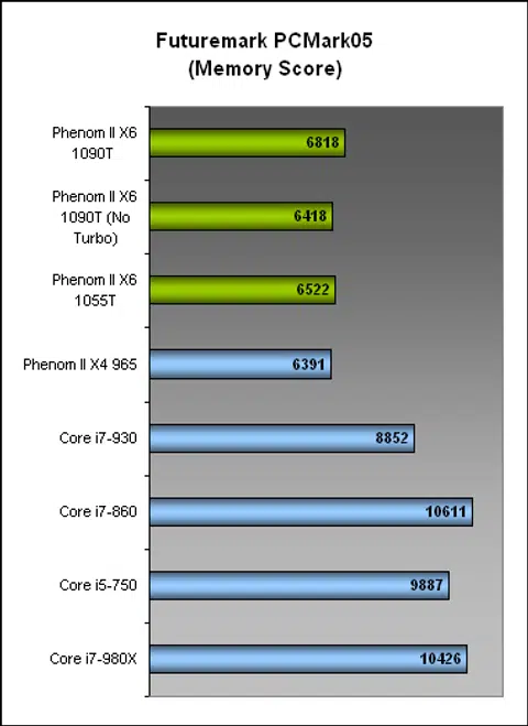 Going by PCmark05's CPU score, the Phenom II X6 was on par with AMD's own expectations, with the 1090T beating the Phenom II X4 965, the Core i7-930 and i7-860. The 1055T was less impressive, though it too managed to stay competitive with the Core i5-750. When it comes to the memory subsection however, the Phenom II architecture was as usual, trounced by the Intel processors; the only consolation is that the Phenom II X6 did beat its own quad-core competitor.