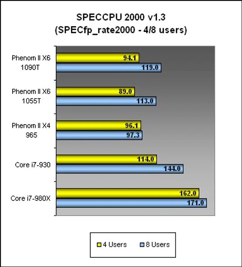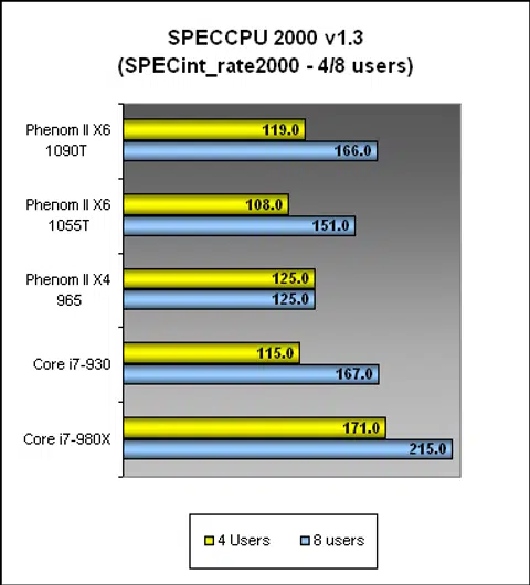 While the Intel contingent predictably had higher peak values for both integer and floating point performance in this benchmark, the focus was on how the Phenom II X6 performed relative to the quad-core Phenom II X4 965. The X6 1090T however failed to show a significant improvement over the 965 for both. Moving onto the integer rate results, the 1090T managed to stay competitive with the Intel Core i7-930, but not in floating-point rate results. However, the AMD 6-cores both showed improvement over the Phenom II X4 965 at 8-user workloads, which does prove that there is some value in having more cores if you have highly threaded workloads.
