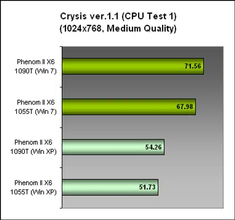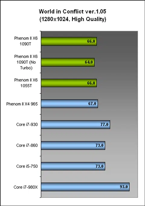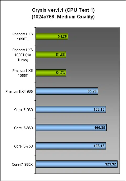 It's in the gaming benchmarks that we ran into some hitches. World in Conflict had the Phenom II X6 barely matching the Phenom II X4 965, which at 3.4GHz, is admittedly faster than the default (non Turbo) 1090T. However, that just meant that Turbo Core was not really helping in this benchmark, despite our impression that this game could not be using three cores. More bad news was to follow in Crysis. Discounting the Intel processors, the Phenom II X6 was surprisingly a lot slower than the Phenom II X4 965. It was such a shock that we even reformatted our system and reinstalled everything to verify that everything was in order - twice!.
