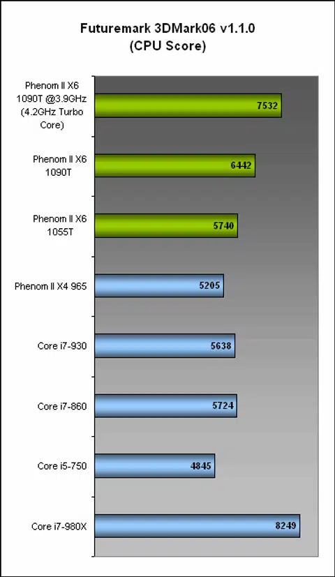 AMD recognizes that even with six cores, its Phenom II X6 processors will find Intel's more expensive offerings out of their performance and price bracket. Hence, the ideal price-competitive rivals for the Phenom II X6 1090T are the Core i7-930 and Core i7-860, which at US$295 and US$280 respectively, are closest to the US$289 retail price of the 1090T. Meanwhile, the US$199 Phenom II X6 1055T is pitted against Intel's mainstream Core i5-750, which is being sold at that price. For comparison's sake, we have also included results for AMD's current quad-core champ, the Phenom II X4 965 (US$186) and also Intel's 6-core Core i7-980X.