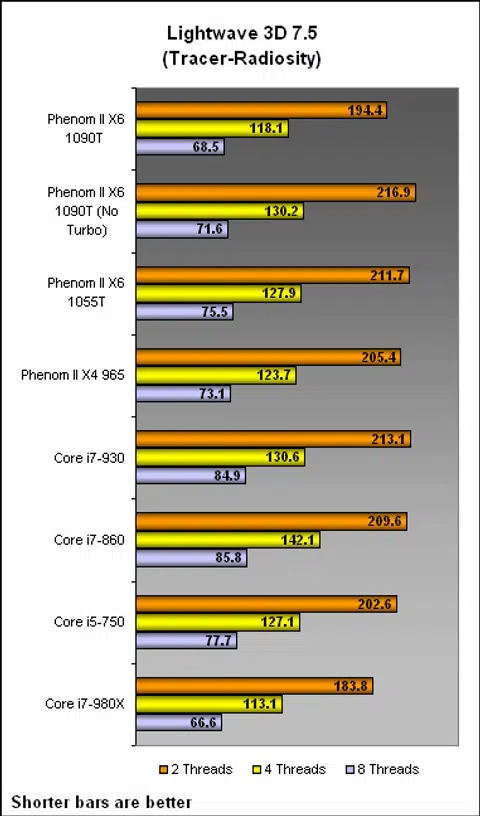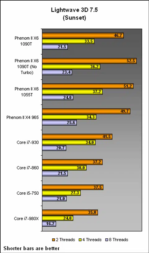 One of the main reasons for buying a processor with more cores - 3D rendering. And Lightwave 3D should help to illustrate this. With the Tracer-Radiosity workload, the 1090T was second only to the Core i7-980X, with Turbo Core making a significant impact. The performance of the 1090T without Turbo Core was slower than the Phenom II X4 965, but this changed once we enabled it. Meanwhile, the 1055T was faster than all of the Intel processors except for the Core i7-980X at four and eight threads. The Intel contingent did improve in the Sunset workload, which eroded AMD's slight lead and made it very competitive between the two camps.
