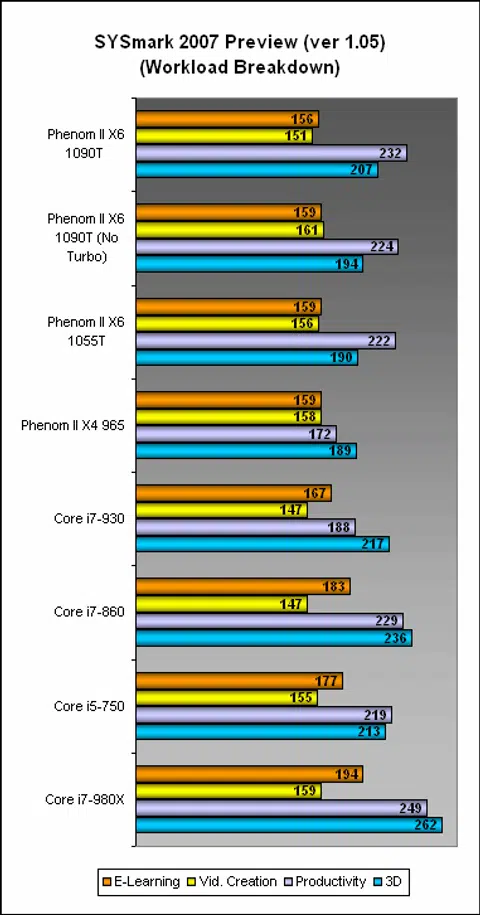 Interestingly, in SYSmark 2007, we found that enabling Turbo Core appeared to have little effect on the overall score. However, given that the margin between the 1090T and the 1055T is so narrow, it could be that with or without Turbo Core is just too close to call. We do find some differences in the breakdown, with the Turbo Core improving the Productivity and 3D scores, though having no Turbo appeared to benefit Video Creation, which on paper, should have negligible difference, since we can assume that video encoding would stress all the cores and hence Turbo Core should have no impact.