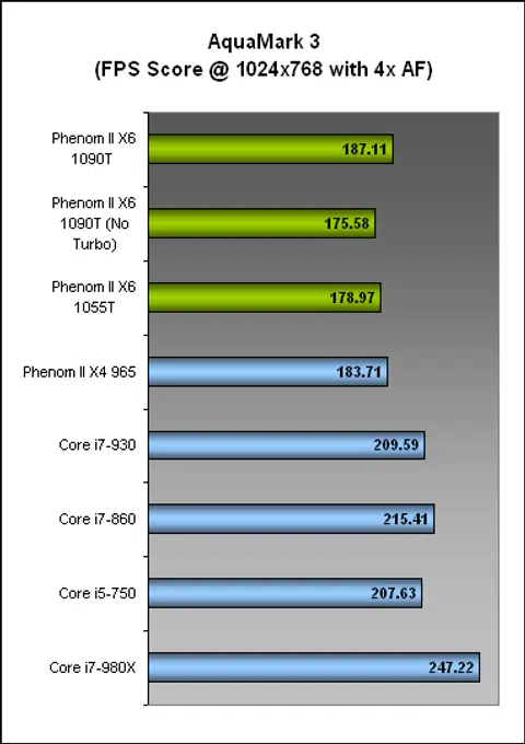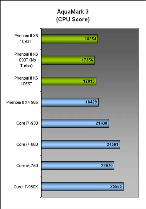 The Phenom II X6 continued its decent run in 3DMark06, where they were competitive in both the CPU score and the overall. Turbo Core here played its part in ensuring that the 1090T was just ahead of the Core i7-860. AquaMark3 however saw the Intel camp streaking ahead and even the Phenom II X4 965 had marginally higher CPU scores than the 1090T.