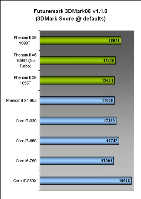 However, the scores did not improve with the format and the Phenom II X6 was still much slower than the Phenom II X4 965. We decided to try it in Windows 7, where presumably there should be no issues related to the OS scheduler and its effect on Turbo Core. While the scores were much improved (more likely due to the newer 195.62 ForceWare drivers for this newer OS), they were still a long way off what we expected. Trying the 1090T with another motherboard (the MSI 790FX-GD70) yielded similarly poor results, which led us to conclude that this issue was with the processor. Meanwhile, we'll keep a tab on this to investigate this outcome further in the near future.