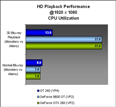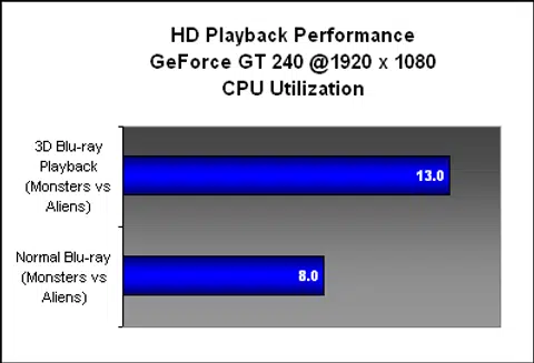 As you can see, the 3D Blu-ray playback added almost twice the amount of stress on the CPU, with our Core i5-750 spending up to 13% of its resources processing the movie. In contrast, the normal non-3D Blu-ray playback took up only 8% CPU utilization. Considering that each of the four CPU cores makes up 25% of CPU utilization, this means when running the 3D title in its full glory, it consumed almost half of a single processing core's resources. Not much of a problem for quad-core processors, but it could be something of a concern for a dual-core processor. This however is with the GeForce GT 240 doing the heavy lifting, with the newer VP4 (PureVideo HD) engine on this 40nm GPU likely responsible for undertaking the burden.