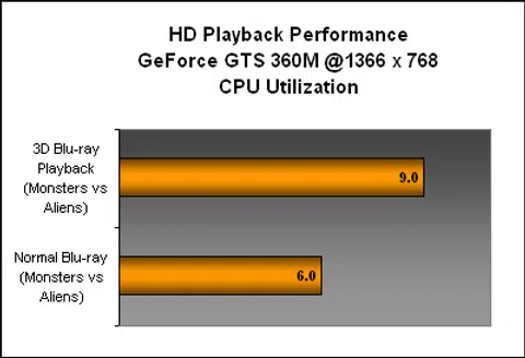 To find out how this system and the GPU performed during the 3D Blu-ray playback, we selected a 3 minute segment from the Monsters vs Aliens 3D Blu-ray movie that appeared to be the most taxing (high bitrates as indicated by CyberLink PowerDVD's info overlay) and played it in both 3D and 2D mode. In 2D mode, the bitrates hovered between 20 - 30Mbps while switching to 3D Blu-ray resulted in an increase to 40 - 50Mbps, which borne out the contention that there will be a 50% increase in bitrate/capacity with a 3D Blu-ray disc. CPU utilization figures were recorded using the built-in Performance Monitor in Windows 7.